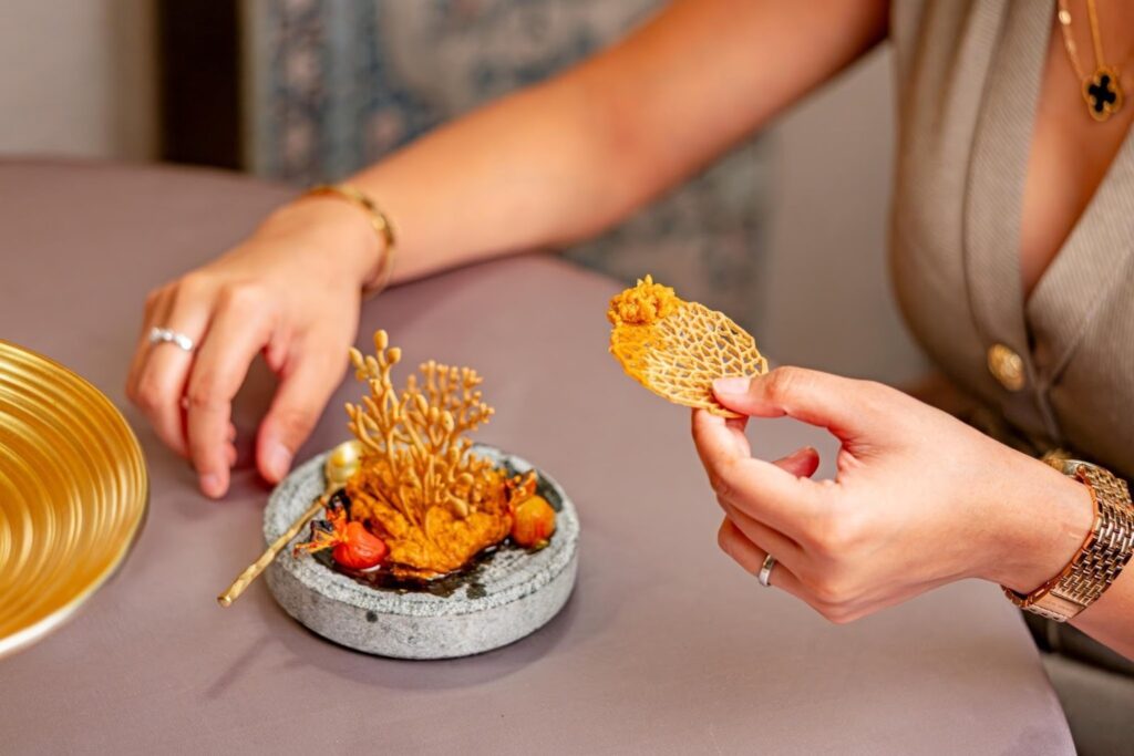 Together, their philosophies shape a ten-course degustation menu where food becomes both memory and metaphor — celebrating seasonal ingredients, narrating stories, and embracing Ayurvedic wisdom with modern finesse.